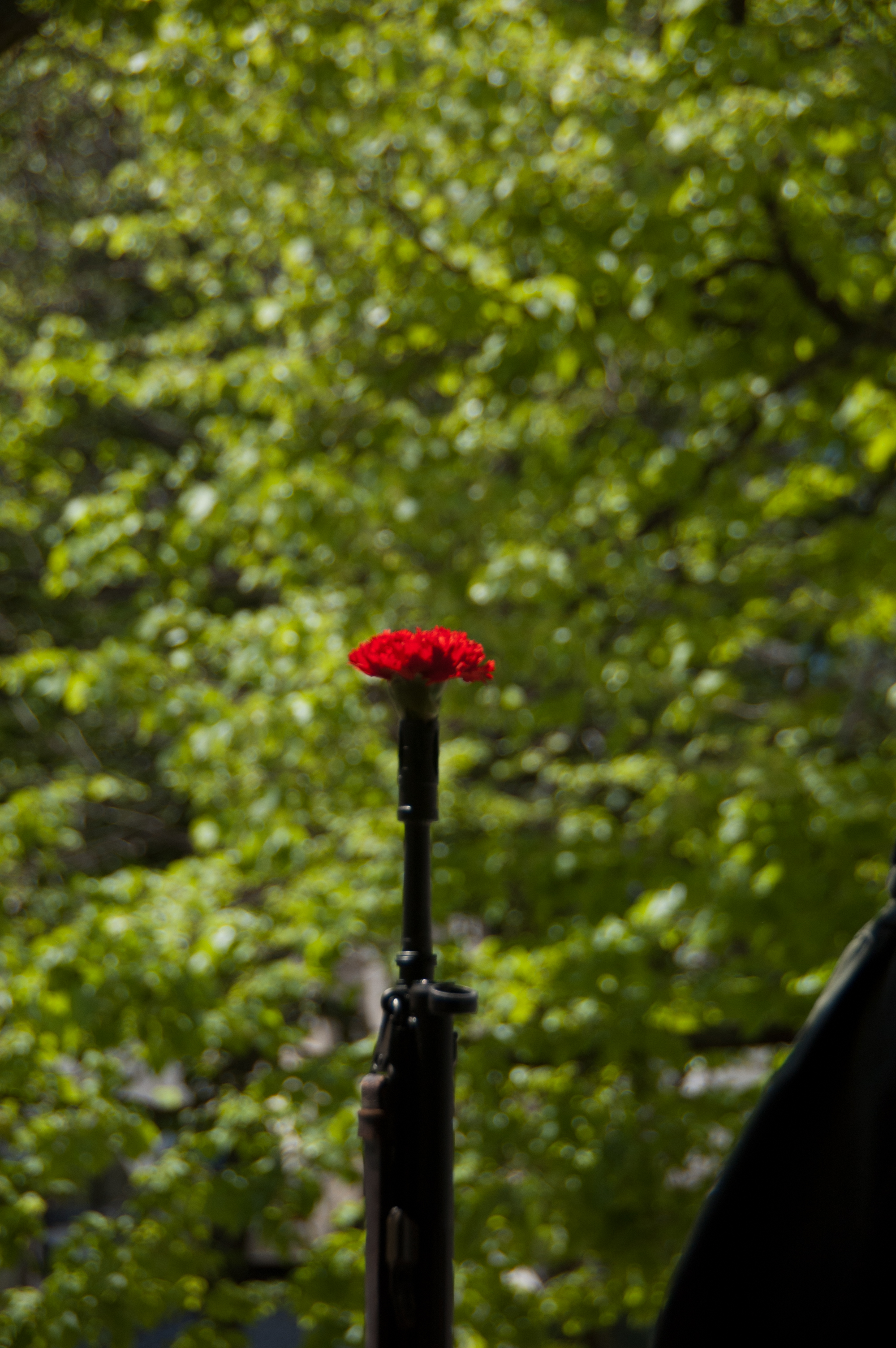 No Terreiro do Paço o sol encandeia. Há muita gente sentada nas esplanadas, muita mais foi até à praia. Ali, no inicio da R. do Arsenal eram 10 da manhã quando o Capitão Salgueiro Maia, figura incontornável do 25 de Abril, se interpôs entre os seus homens e os tanques das forças do regime. Levava um lenço branco na mão e recusou a ordem para ir para a retaguarda dos seu homens. O Brigadeiro deu ordem de disparo, ignorada por todos os homens. Mais tarde entregar-se-ão ao Movimento e passarão a fazer parte deste.