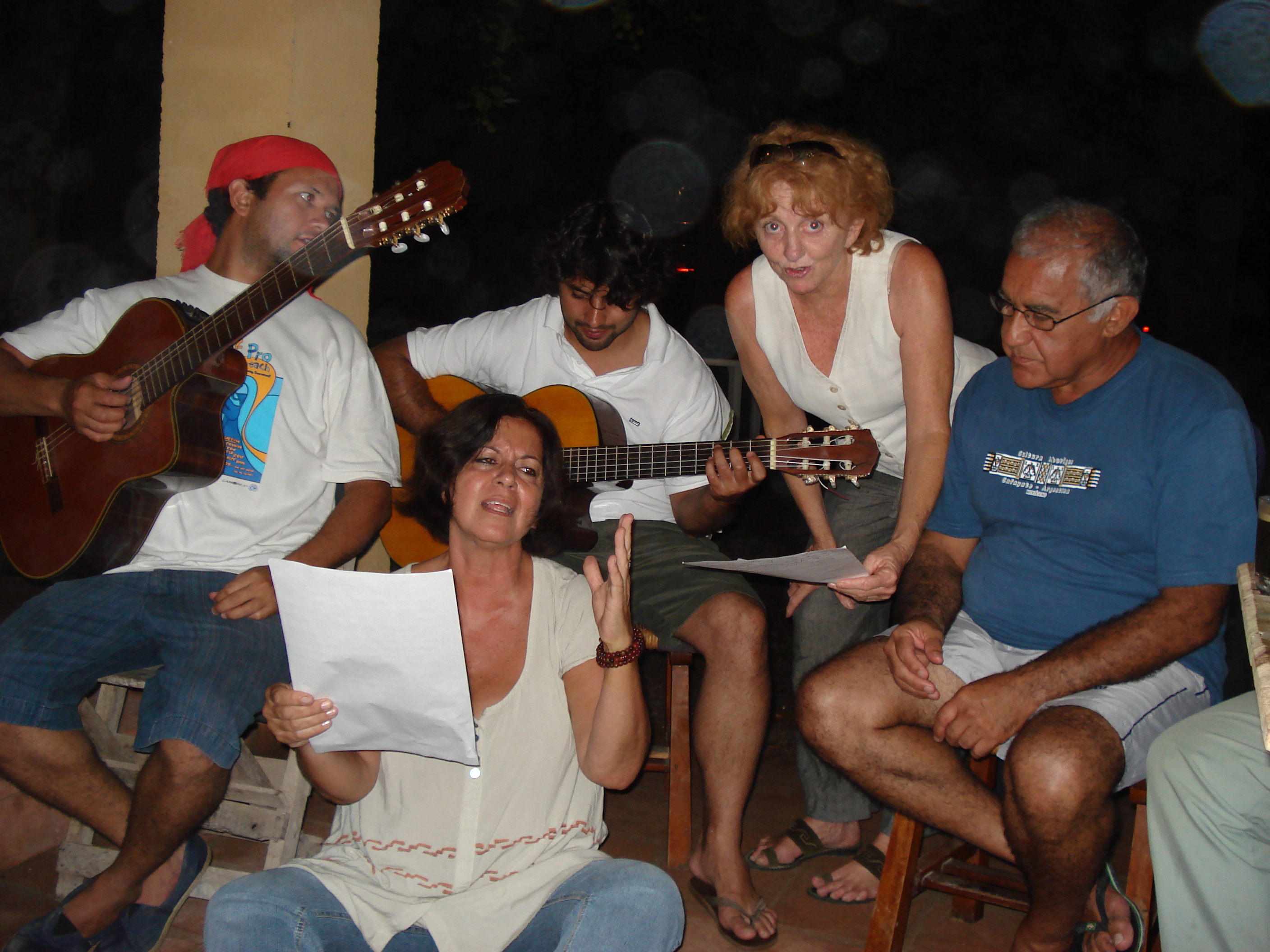 Sobre a melodia de duas guitarras José fecha os olhos, respira fundo e declama um poema que, aprendo mais tarde, é uma Cantata Riojana. Tem 70 anos, cabelo branco farto, barriga proeminente e sobrancelhas grossas. Acompanha o ritmo das guitarras, ou são elas que o acompanham a ele? Não sei do que falam estas palavras, e não interessa. Saem pela boca como que espremidas directamente de algum ponto profundo da alma, de um passado comum e comunitário que ficou gravado nos corpos. Somos 50 e estamos mudos. Até as cigarras parecem ter abrandado o seu frenesim. A noite vai longa, o dia mais comprido foi, mas a paixão do que se diz não esmorece um segundo. De repente, do lado oposto do alpendre começam novas palavras, complementando e continuando as primeiras, agora a outra voz.