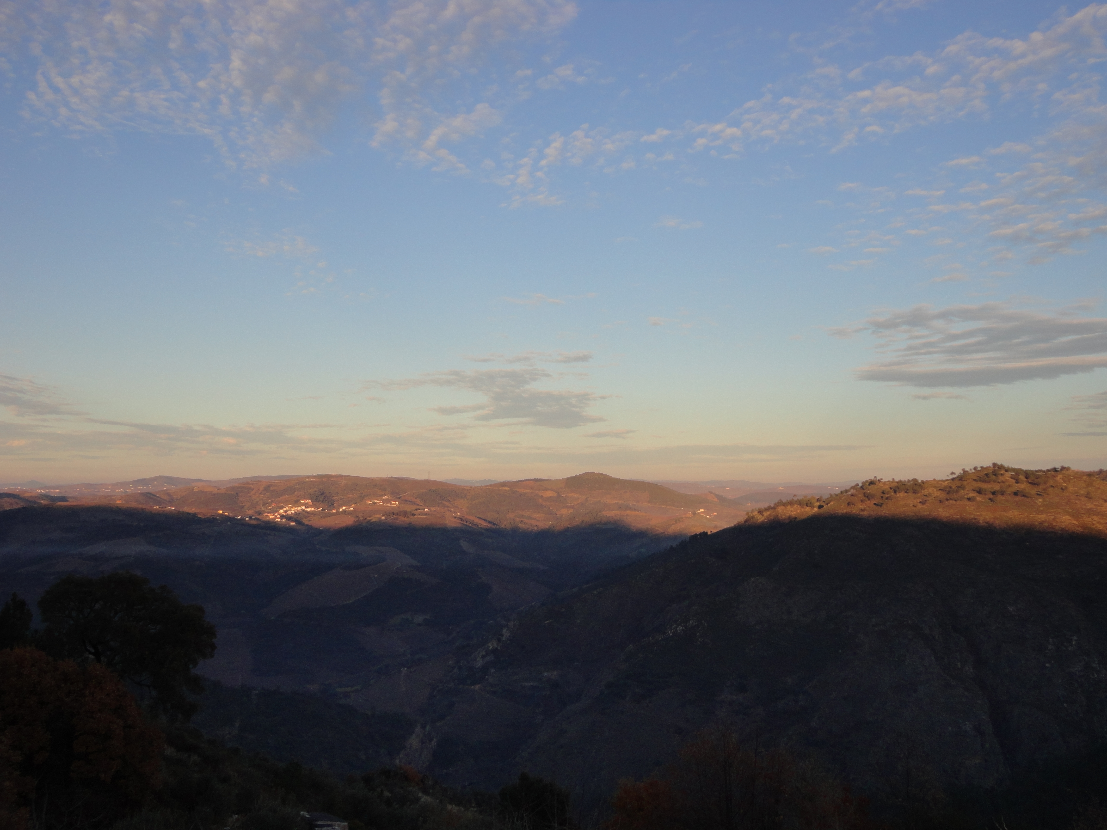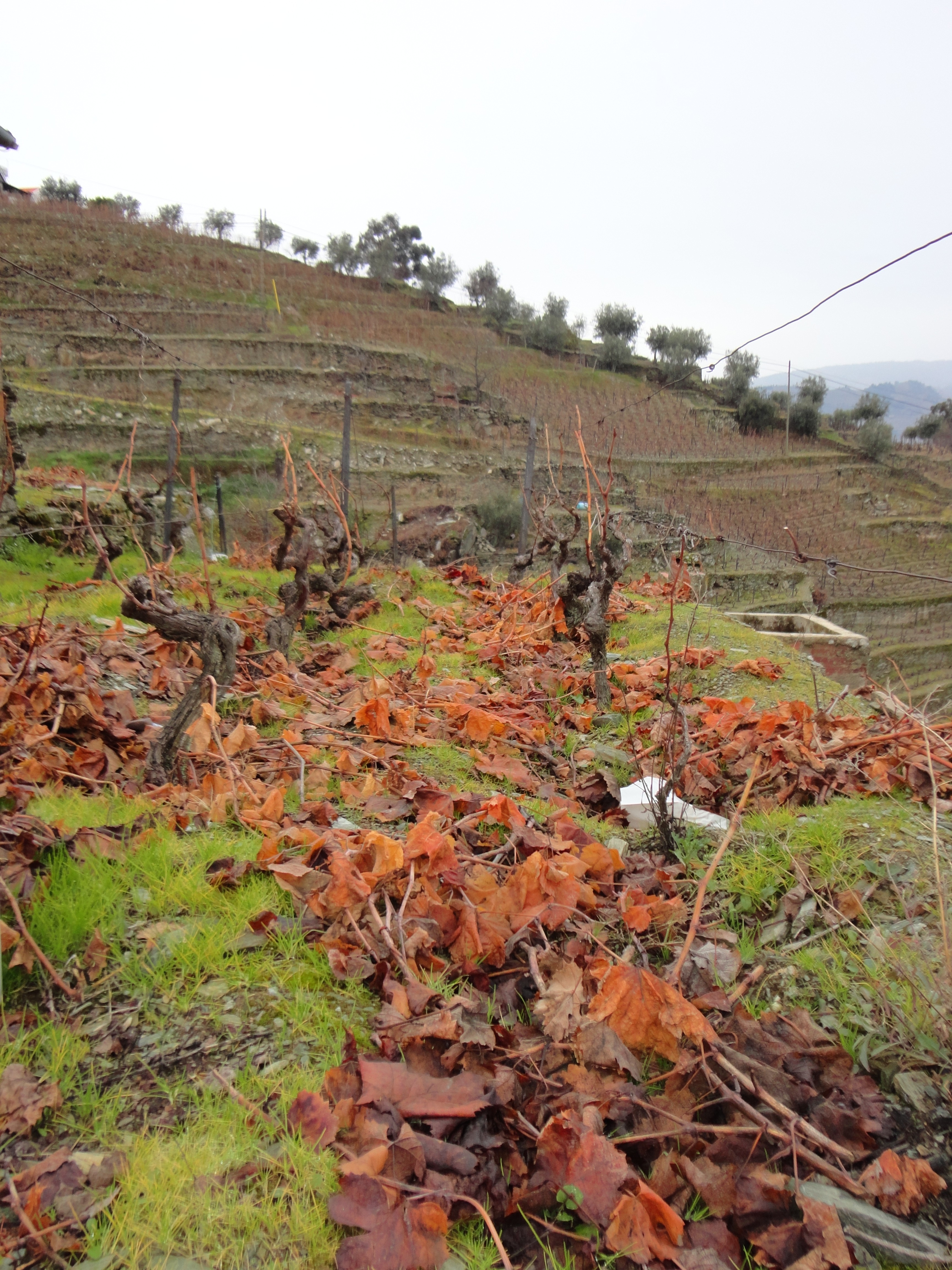 Apoio o caderno num tronco, com os dedos dormentes dentro das luvas. Também não sinto os pés, mas não me apetece mexer-me daqui para já. Há minha volta os socalcos descem ao longo do vale, até ao rio. O silêncio abafado do tempo húmido é interrompido apenas pelo pio dos pássaros e algum carro em esforço nas estradas inclinadas que não se vêm daqui. Árvores de diospiros sem folhas, mas carregadas de bolas laranja pontilham algumas zonas. O Douro, sem sol, parece de chumbo.