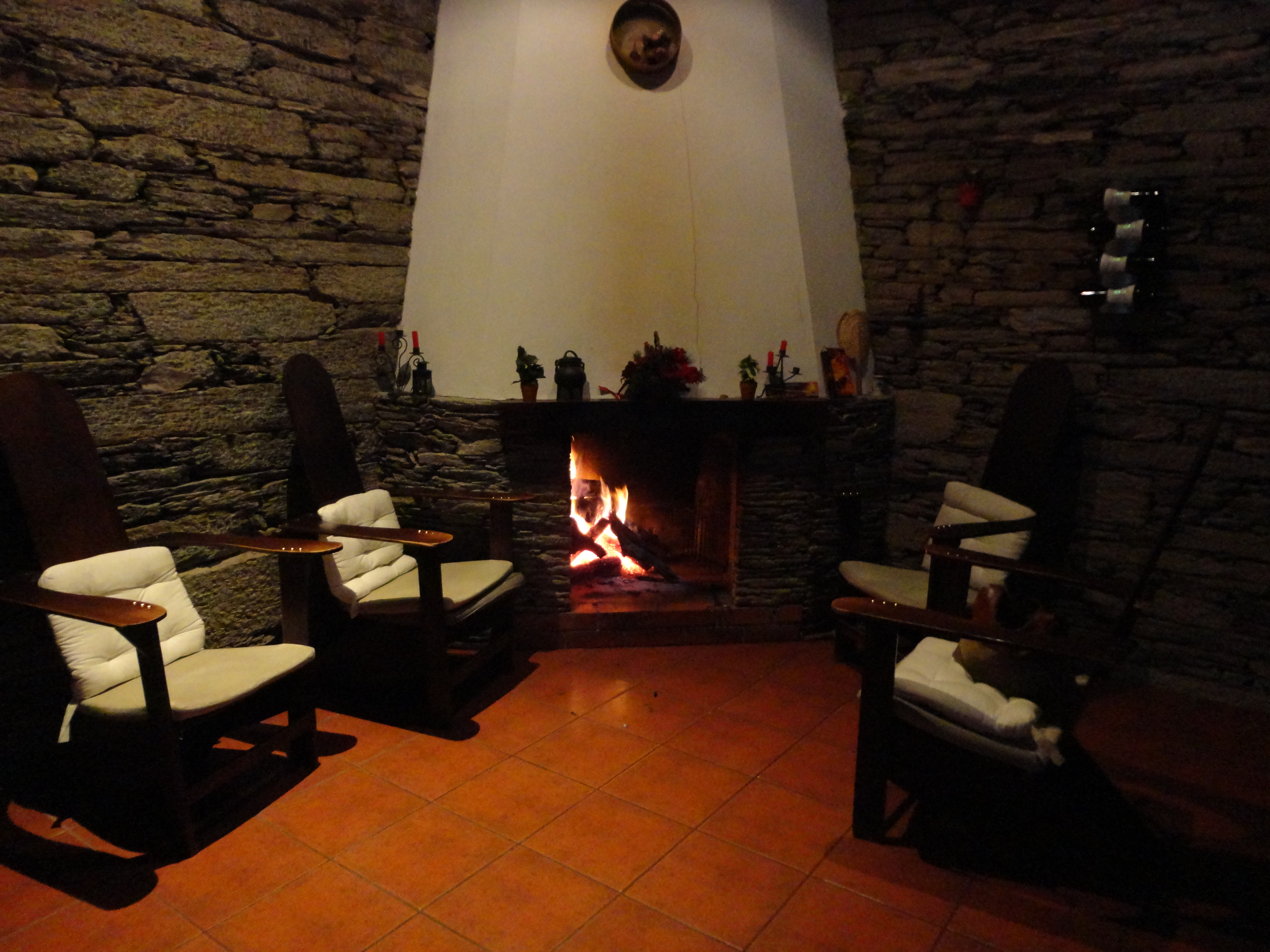 Paulo abre-me a porta. e encaminha-me para a sala de estar “Vamos para aqui que está mais quente”. Lá dentro está Artur, o pai. Estende-me a mão. “Ui, que mãos tão frias! Sente-se alí à lareira” e coloca mais lenha “Pronto, assim já vai aquecer”. Paulo volta com um copo de vinho “Porto de boas vindas”. Senta-se à minha frente. Eu iluminada e aquecida à direita, ele à esquerda. Estendemos as pernas, reclinamo-nos no cadeirão e a conversa acontece. Falamos da região, dos caminhos por onde andei perdida. Pergunto pela casa e tudo o resto flui a partir daí.