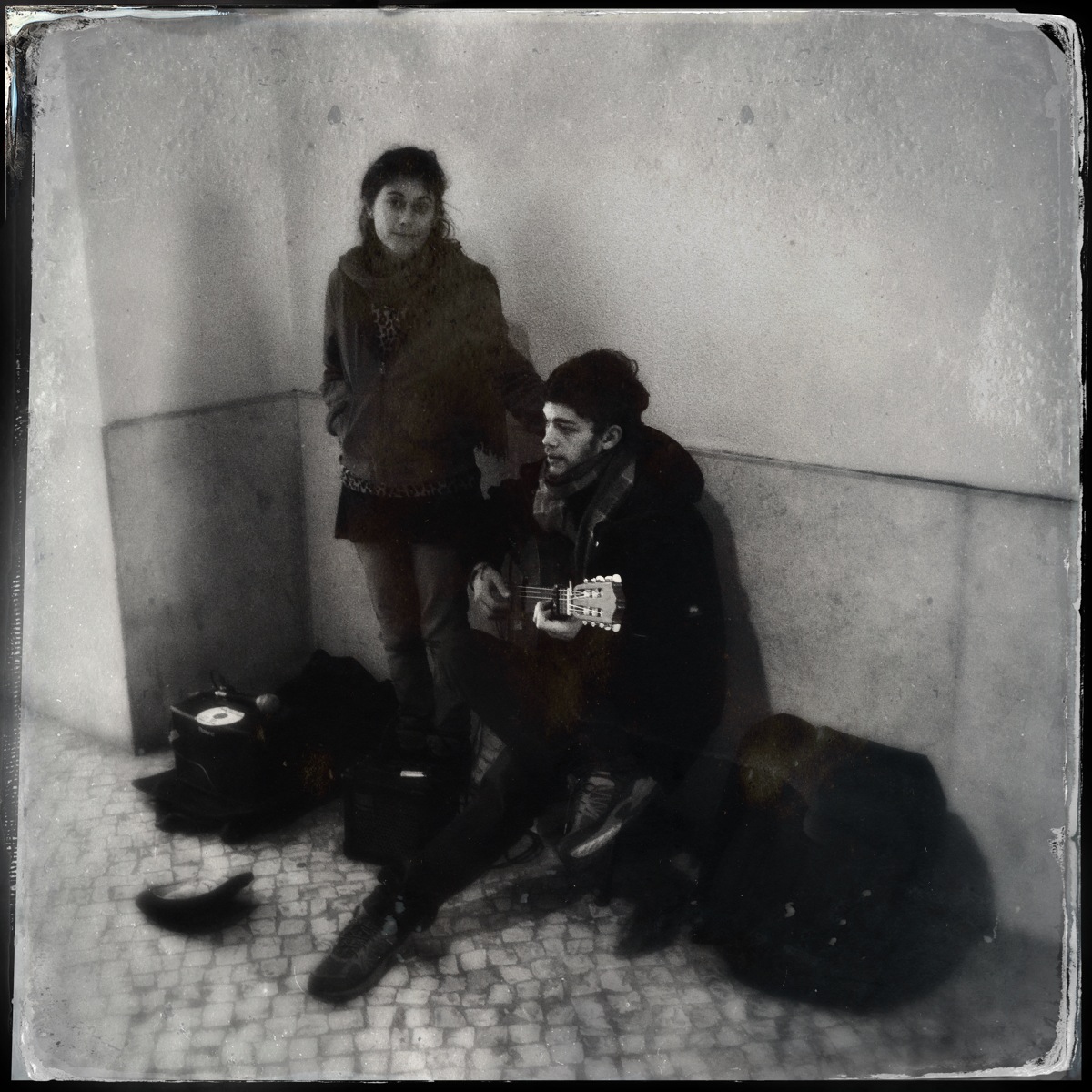 “Tocamos juntos porque vivemos juntos e porque foi a música que nos juntou” – diz ela com um sorriso de embalar. De facto, nada parece desafinar a firmeza daquele dueto. Nem o preconceito de quem passa, nem a crise que trespassa. Contam-me que “é muito difícil tocar na rua por causa das licenças” e “dos polícias, que connosco são muito simpáticos mas que já confiscaram o saxofone de um cigano que toca muito bem”. Indago sobre os músicos de rua no Chiado e em Lisboa. “Existe um rapaz de rastas que é muito bom no trompete” e “um outro francês que costuma tocar violoncelo”. Adivinho a itinerância da sua arte. O prazer de fazer música não permite pagar 300€ por mês para se poder tocar na rua Augusta; problemas com a polícia ninguém quer.