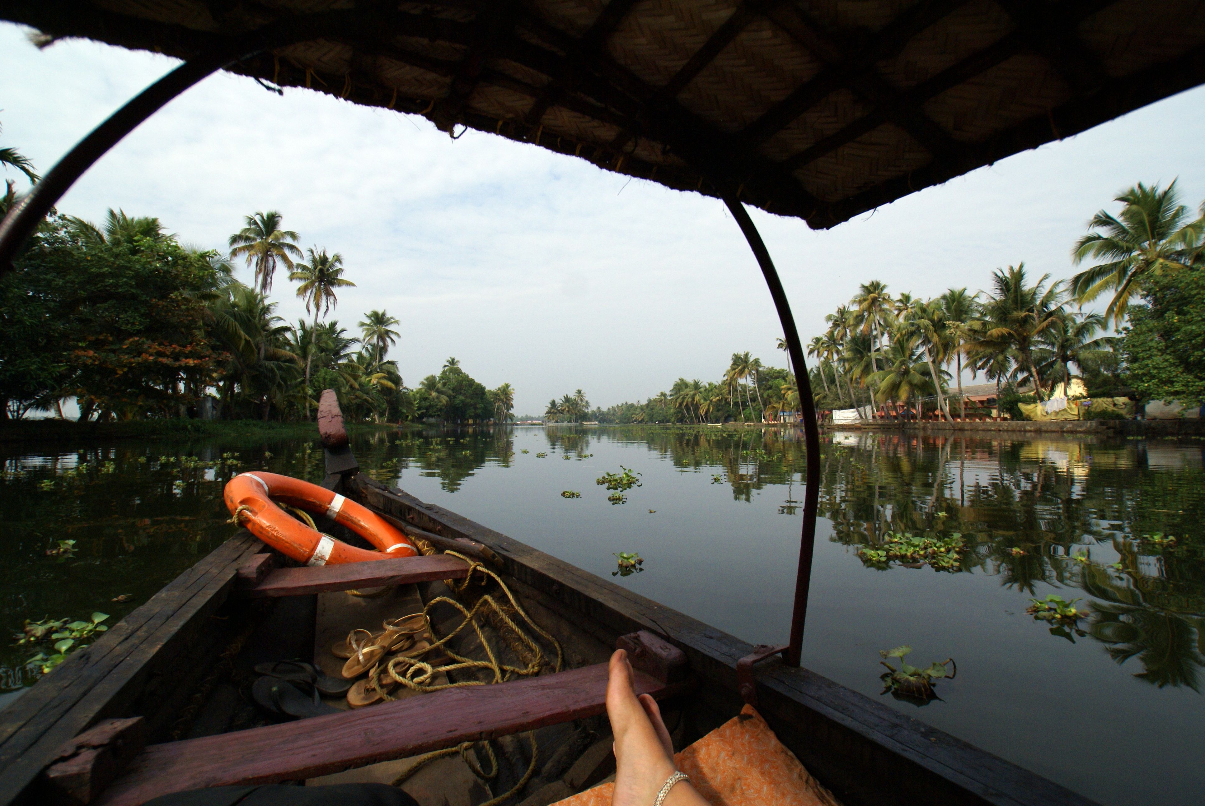 Em Varkala fiquei também alguns dias, com duas amigas. Lá, tornámo-nos amigas de Sarath, o dono do bar ao lado do nosso quarto. Todas as noite por lá passávamos e ficávamos na conversa. Sarath é de Allepey e quando lhe perguntámos qual seria a melhor maneira de explorar as Backwaters não só nos desaconselhou a ficar num house boat, ao contrário do que vinha sugerido em todos os guias e se via publicitado por toda a parte, como ligou do seu telefone para os amigos que tem por lá e tratou da nossa reserva na Vrindhanavanam Heritage Home. Ao chegar, fomos recebidas como “as amigas do Sarath”, e a seu conselho, marcámos uma manhã de passeio em canoa pelas Backwaters, em vez da pernoita no house boat. Ao ver passar dezenas destes barcos que tinham ficado ancorados no mesmo sitio e estragavam a paz daqueles canais com os seus motores percebemos o quão acertado tinha sido o seu conselho. Nós, deslizávamos pelos canais secundários ao ritmo dos remos e dos pássaros, acompanhando a vida das aldeias nas margens.