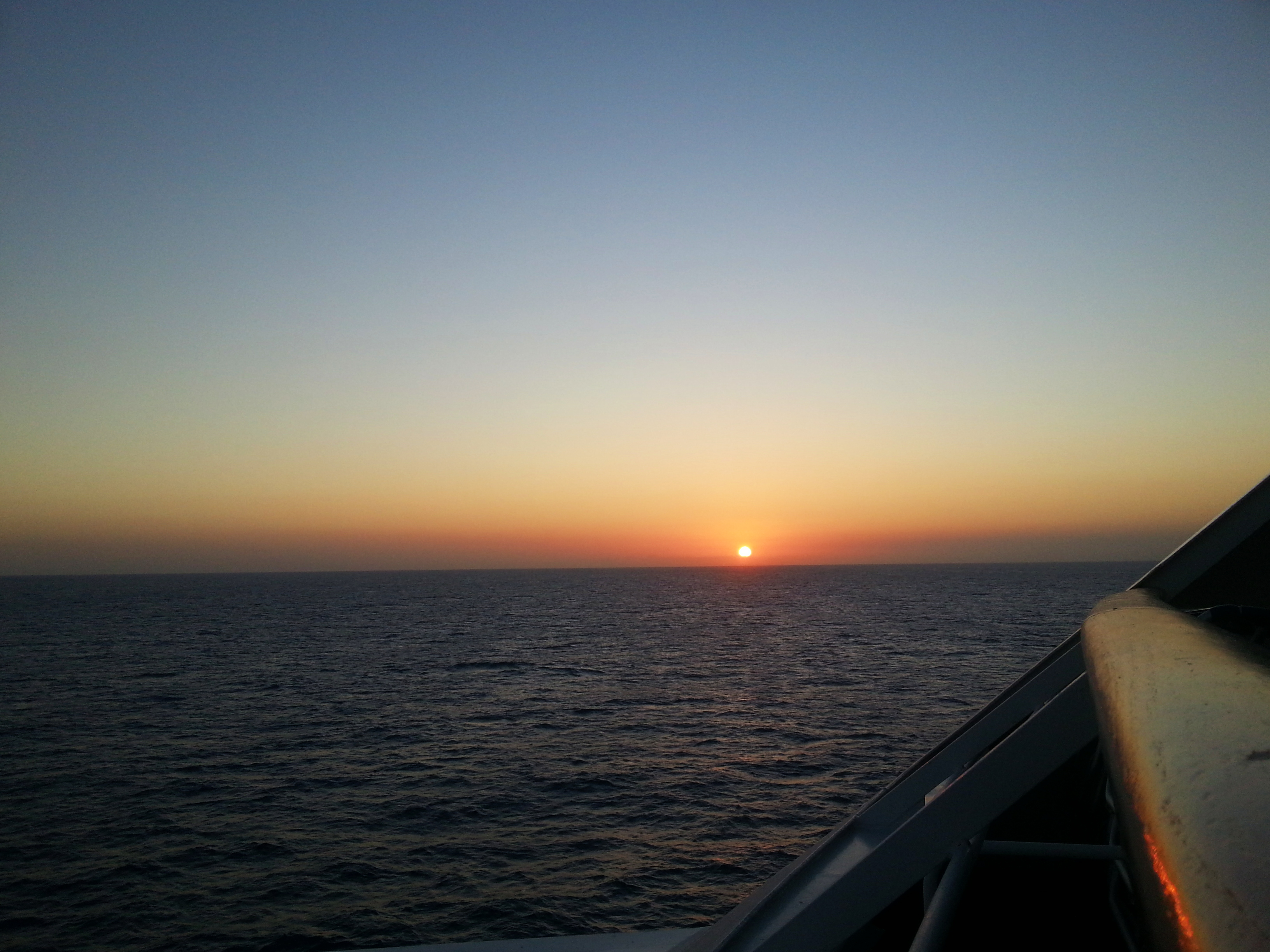 Mudei-me para a parte da frente do barco, um deck exterior pequeno, à frente dos camarotes do 7º piso, onde não está ninguém. Volta e meia passa um grupo de dois ou três Brasileiros, diz “Ai qui lindo”, tira uma selfie e volta para a confusão. Eu, voltei à minha rotina livro, caderno, dormir, repetir, até que o sol se ponha.