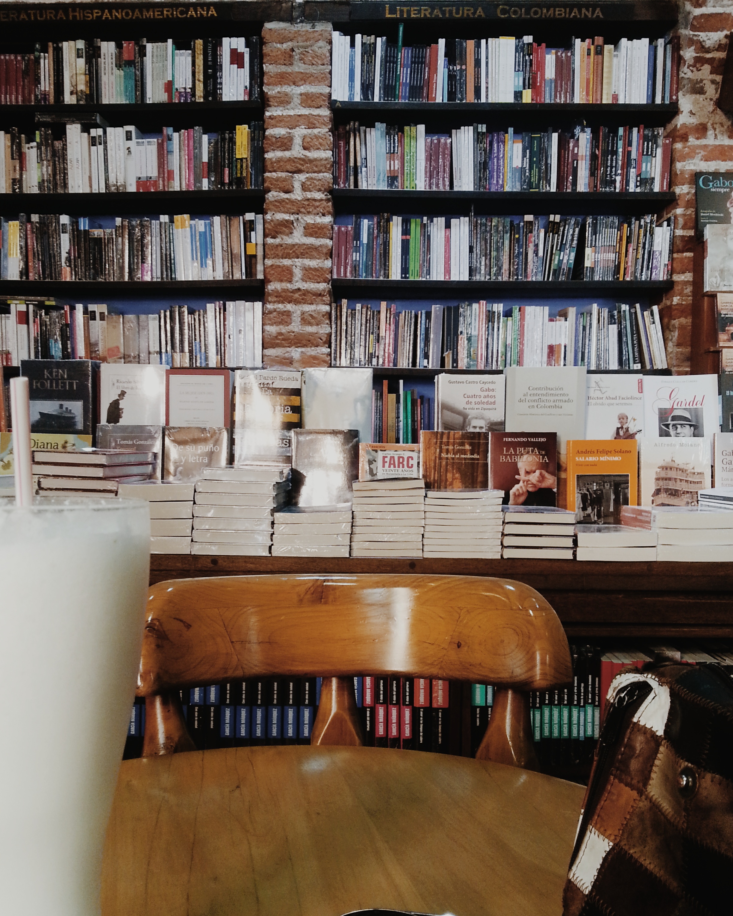 Termino a limonada e percorro as estantes de Literatura Colombiana. Já me faz falta um “livro livro”… papel. Tiro Efrain Medina Reyes, o Cinema Árbol. Não tem o preço, por isso dirijo-me à caixa, na entrada. O balcão do café é em frente a esta, e estão a tirar fotografias do lugar e de pormenores.