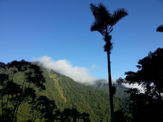 No segundo dia, subimos e descemos, subimos, subimos, subimos, descemos, descemos, descemos. Cruzamos o Rio Buritaca por uma ponte, afastamo-nos dele, subimos, descemos, subimos, descemos. A humidade torna o ar espesso, mais difícil de respirar. Há paisagens abertas lá em cima, a serra a toda a volta, verde, verde, verde, e paisagens fechadas cá em baixo, árvores que se debruçam sobre nós, verde, verde, verde. Subimos e descemos, subimos e descemos.