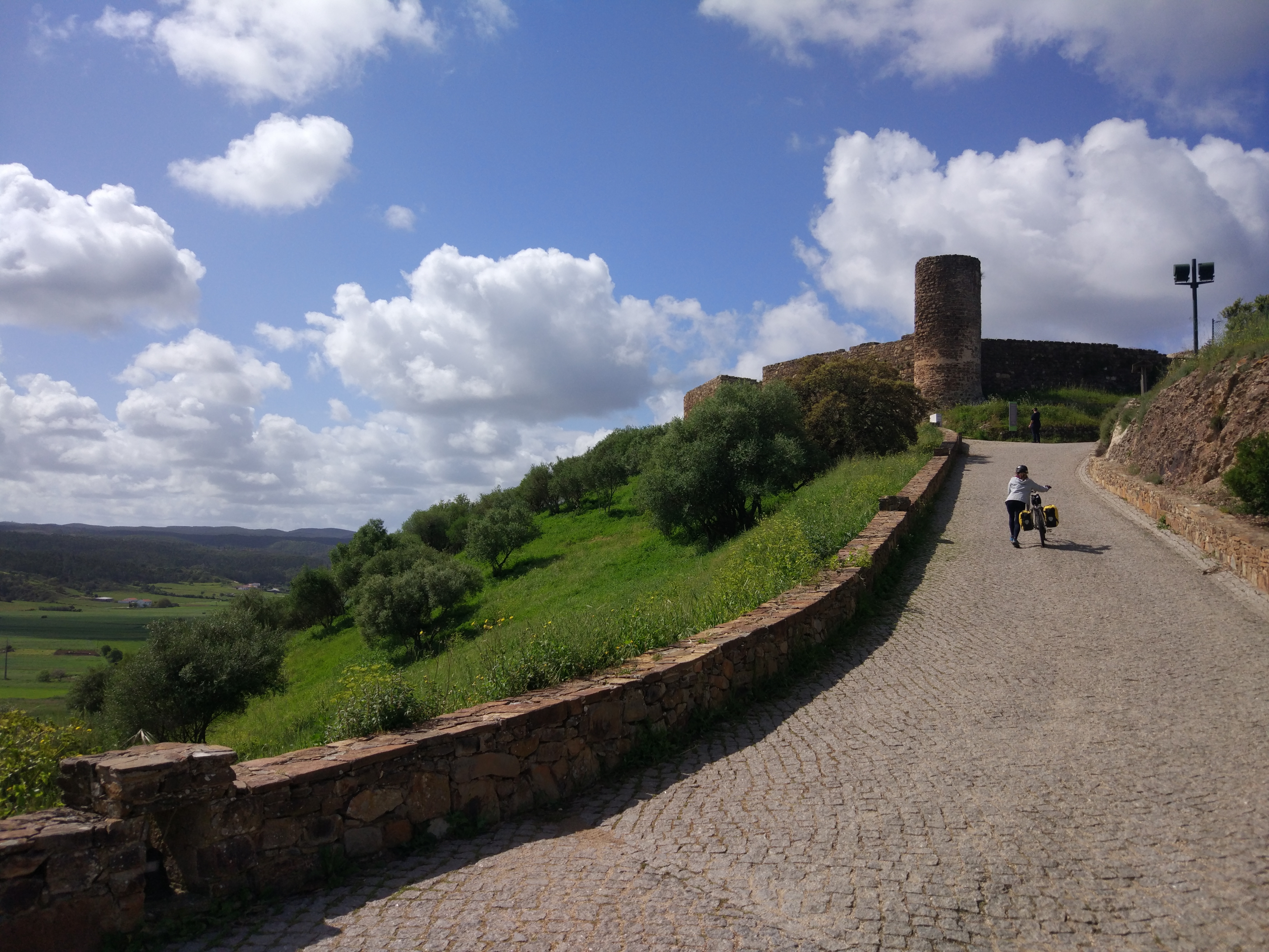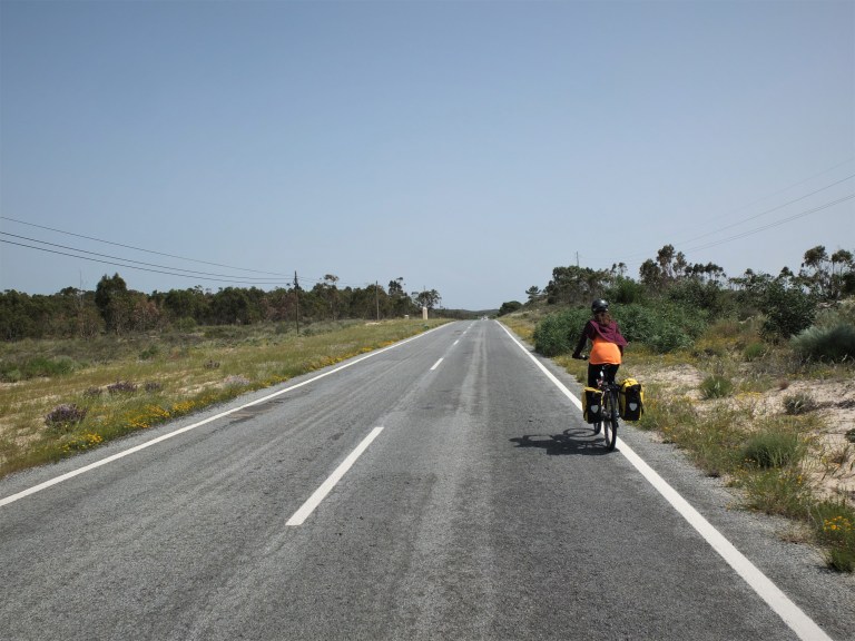 Partimos de Lisboa, mas o percurso foi Tróia – Sagres. Chegar a Tróia é passeio, mas foi logo aqui que caí. A dez minutos de casa. Parada num semáforo. Vá, a parar. Em minha defesa, nunca tinha andado com alforges carregados. E só conta como queda porque fui com as mãos ao chão, e porque houve sangue. Arranhei o tornozelo no pedal, e o orgulho na expressão do Borja. Doeu-me mais o arranhão no orgulho, mas cicatriz só a do tornozelo .