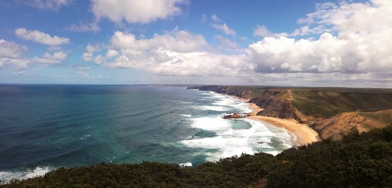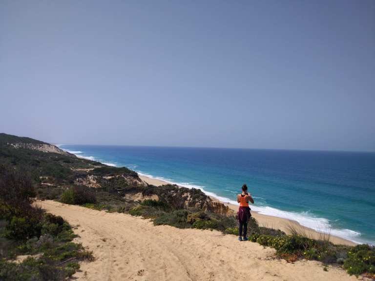Depois da praia do Amado, subimos e descemos por montes e vales cobertos de verde, amarelo e lilás, e eu suava e sorria, a pensar “estou mesmo a fazer isto”.