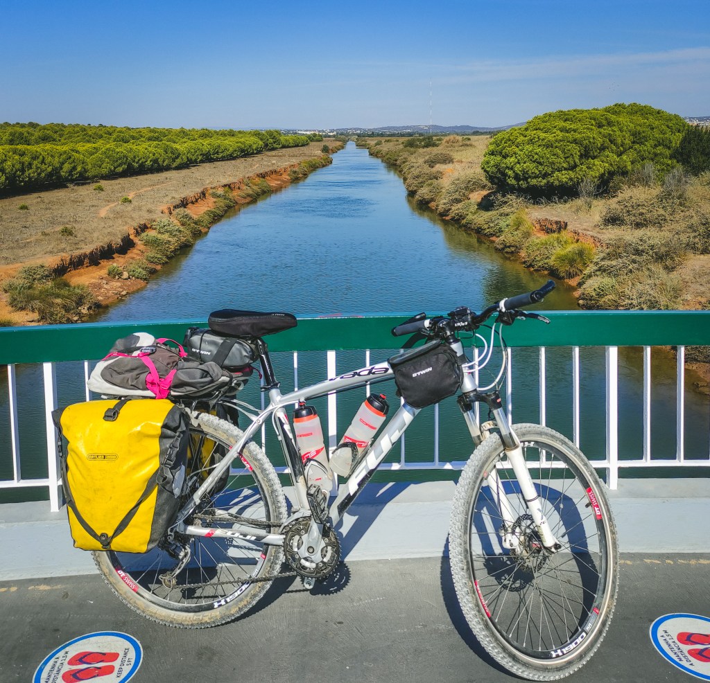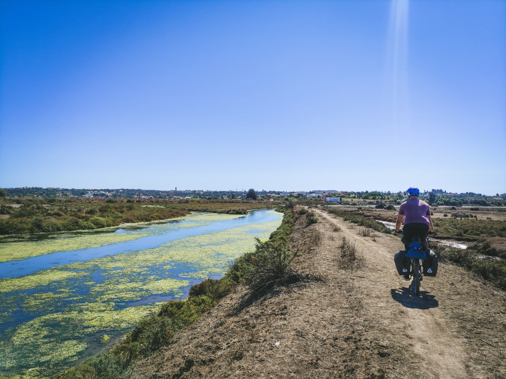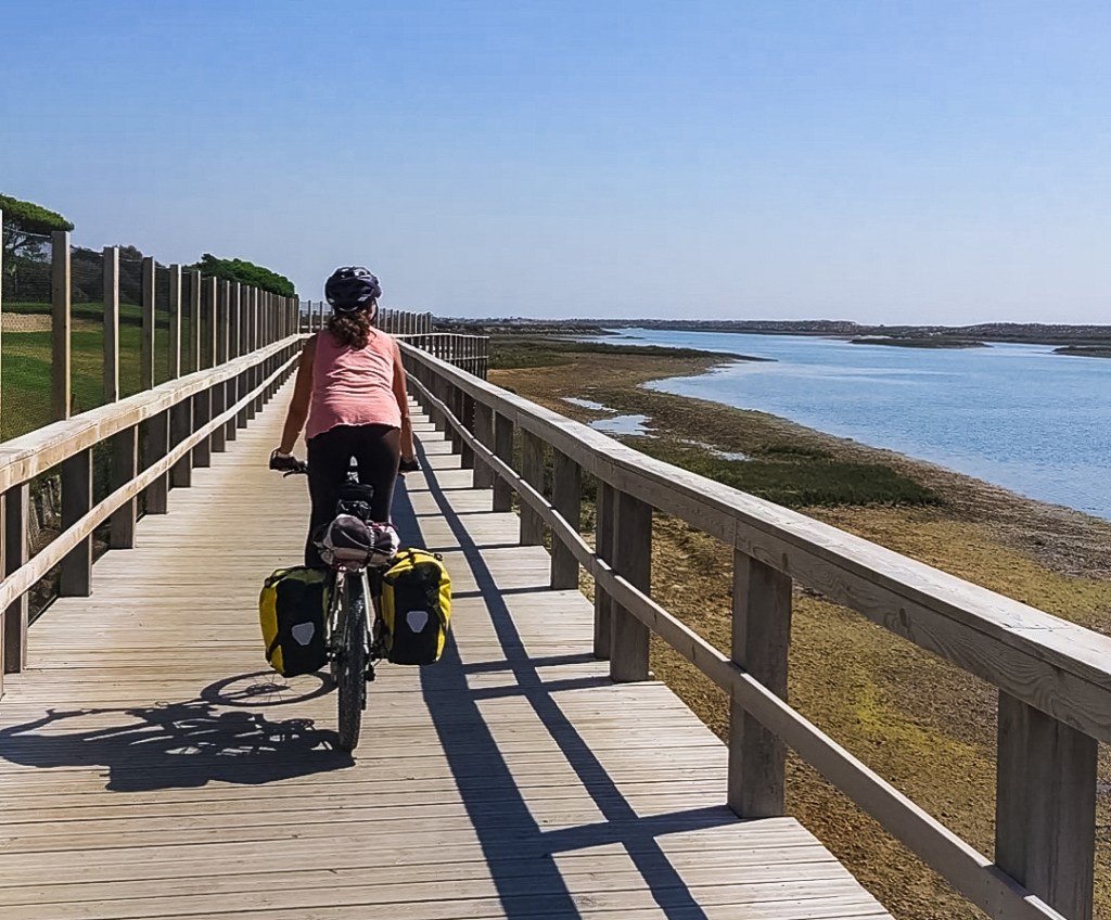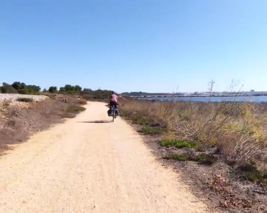 Em 2020, eu e o Borja passámos dois meses na Manta Rota, aquando do primeiro confinamento Covid. Os meus pais têm lá casa e foi o nosso refúgio, depois de fugir do Nepal à pressa. A pé, explorámos tudo o que eram trilhos caminháveis e ruas com pouco trânsito num raio de 20 quilómetros. Demos várias vezes com as placas da Ecovia do Litoral do Algarve e ficámos curiosos. Esta ecovia, com 214 quilómetros, atravessa o Algarve de um extremo ao outro, ligando o Cabo de São Vicente a Vila Real de Santo António. Segue por ciclovias já existentes, caminhos rurais, caminhos paralelos à Estrada Nacional 125 e pequenos troços nessa estrada, seguindo sempre, mais ou menos, ao longo da costa.