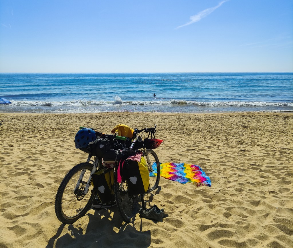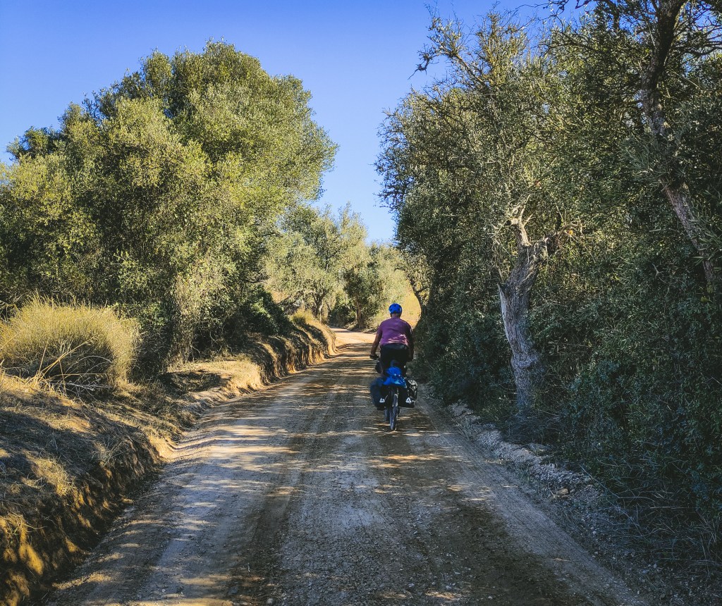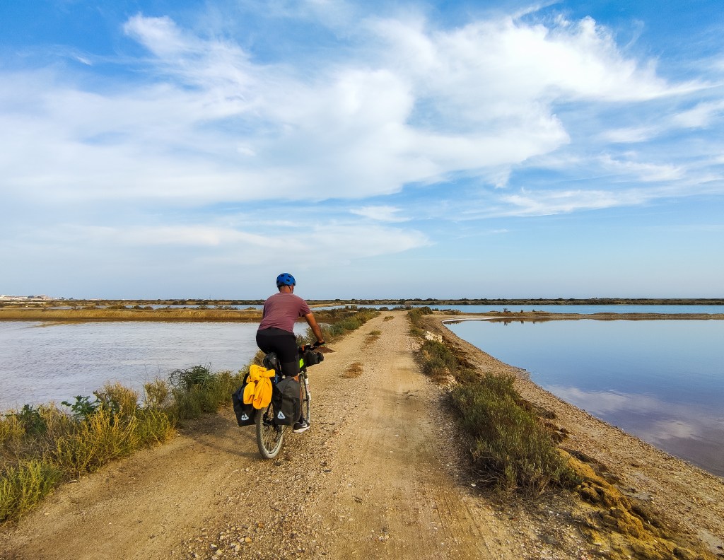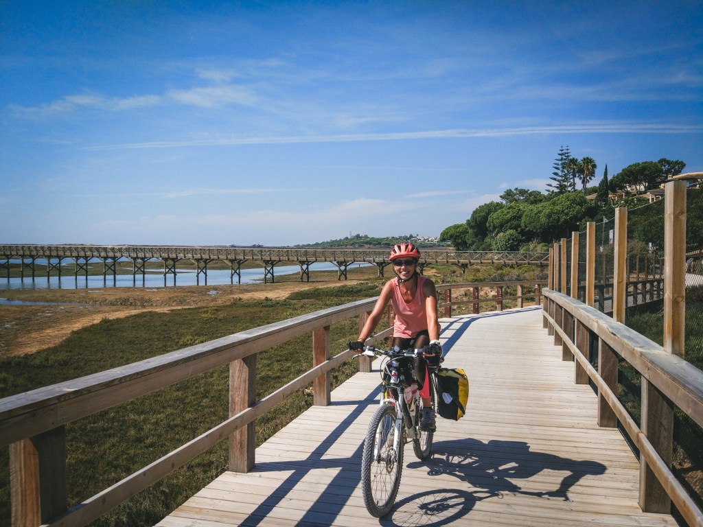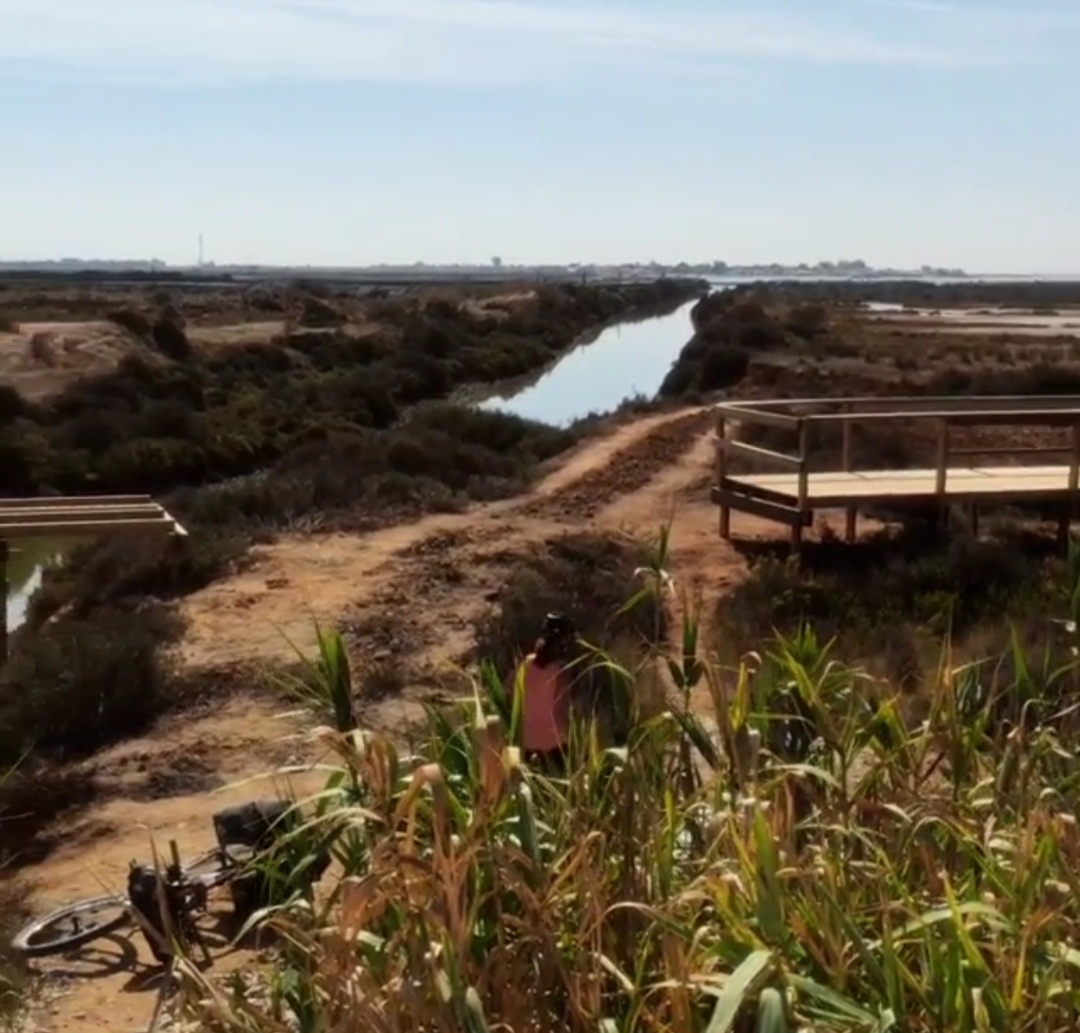 Em 2020, eu e o Borja passámos dois meses na Manta Rota, aquando do primeiro confinamento Covid. Os meus pais têm lá casa e foi o nosso refúgio, depois de fugir do Nepal à pressa. A pé, explorámos tudo o que eram trilhos caminháveis e ruas com pouco trânsito num raio de 20 quilómetros. Demos várias vezes com as placas da Ecovia do Litoral do Algarve e ficámos curiosos. Esta ecovia, com 214 quilómetros, atravessa o Algarve de um extremo ao outro, ligando o Cabo de São Vicente a Vila Real de Santo António. Segue por ciclovias já existentes, caminhos rurais, caminhos paralelos à Estrada Nacional 125 e pequenos troços nessa estrada, seguindo sempre, mais ou menos, ao longo da costa.
