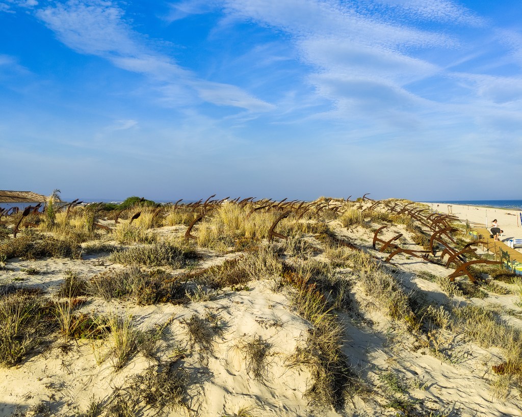 Algures entre Arroteia de Baixo e Luz de Tavira, apesar da facilidade da rota, que alternava entre salinas e estradões agrícolas, com boas vistas da ria, percebemos que não íamos conseguir desfrutar do caminho até à Manta Rota. Voltavam as cólicas. A ecovia passa à porta do aldeamento de Pedras d’el Rei, antes de chegar a Santa Luzia e nós recorremos a um estúdio de última hora. Bendita época baixa. Só faltavam 20 quilómetros, mas teriam sido de sofrimento. Assim, depois de um descanso, ainda caminhámos até à praia dos Barris e o seu cemitério de âncoras, ao pôr do sol.