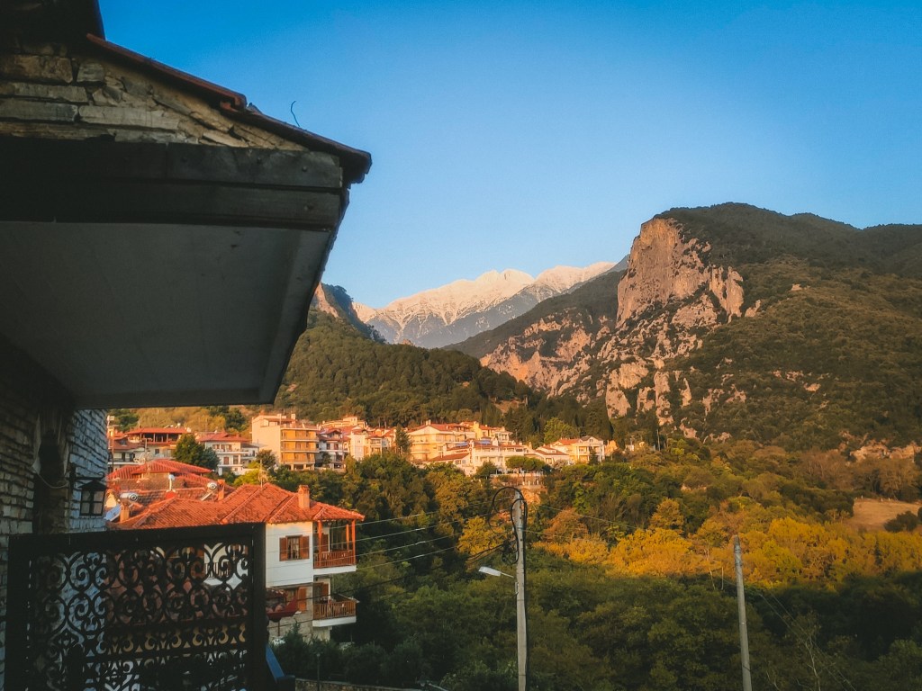Eu já tinha visitado Litochoro aquando da prospecção da minha viagem na Grécia para a Nomad e tinha tido a sorte de escolher o hotel ideal na altura, que decidi repetir. O Afroditi Arthontiko tem quartos bonitos e muito confortáveis, varandas com vista para as montanhas ou para a praça principal, uma equipa do mais simpático que já apanhei e um pequeno-almoço que nos deu para almoço quer no dia da ascensão, quer no dia de viagem a Atenas, depois. As senhoras que nos atenderam trataram-nos como tias cuidadosas e interessadas, deram-nos a escolher os quartos ao nosso gosto e guardaram-nos as mochilas no dia de intervalo entre as reservas, quando fizemos a caminhada e dormimos no Planalto das Musas.