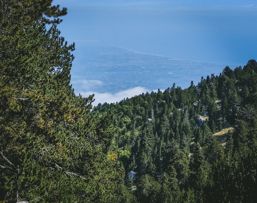 Este é um dos trilhos mais concorridos do parque, mas naquele Setembro tardio, cruzámo-nos com cinco ou seis pessoas, se tanto. Chegámos ao refúgio Petrostrouga, a 1.970 metros, com três horas tranquilas nas pernas. Ao longe, entre os pinheiros, viam-se a costa e o mar.