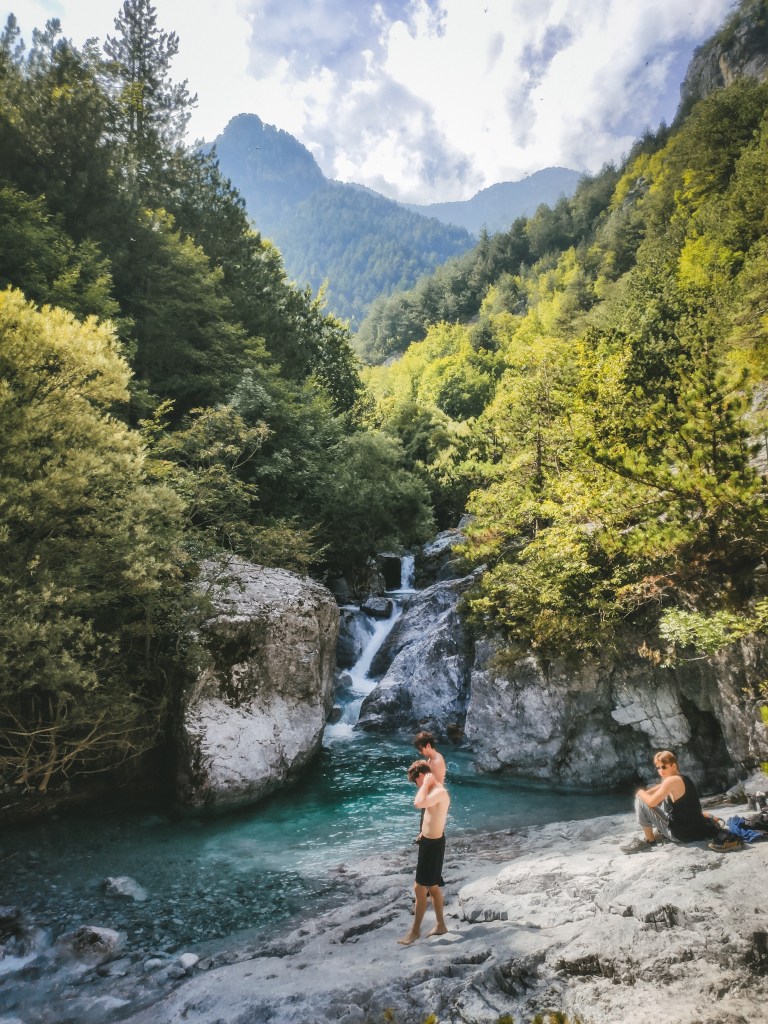 Chegámos de Thessaloniki ao final da manhã, num dos autocarros directos que saem a cada hora. Depois de deixar as mochilas e almoçar, levei o Borja a ver a “banheira de Zeus”. No topo da vila, onde o trilho E4 vem dar após percorrer o desfiladeiro do Enipeas, há uma pequena levada coberta, por cima da qual se pode caminhar facilmente. Em menos de um quilómetro, alternando entre árvores e vistas para as montanhas e o mar, chega-se a uma cascata com algumas poças, a tal “banheira”. O rio Enipeas, luzindo o seu verde transparente característico, corria com uma força que não lhe tinha conhecido da outra vez, fruto da tempestade das semanas anteriores. O caminho é muito fácil e dá um vislumbre da maravilha que é o parque, que percorremos no dia seguinte. Foi um amuse-bouche paisagístico que também nos deu informação sobre o trilho que pretendíamos fazer para descer, parte da rota europeia E4.