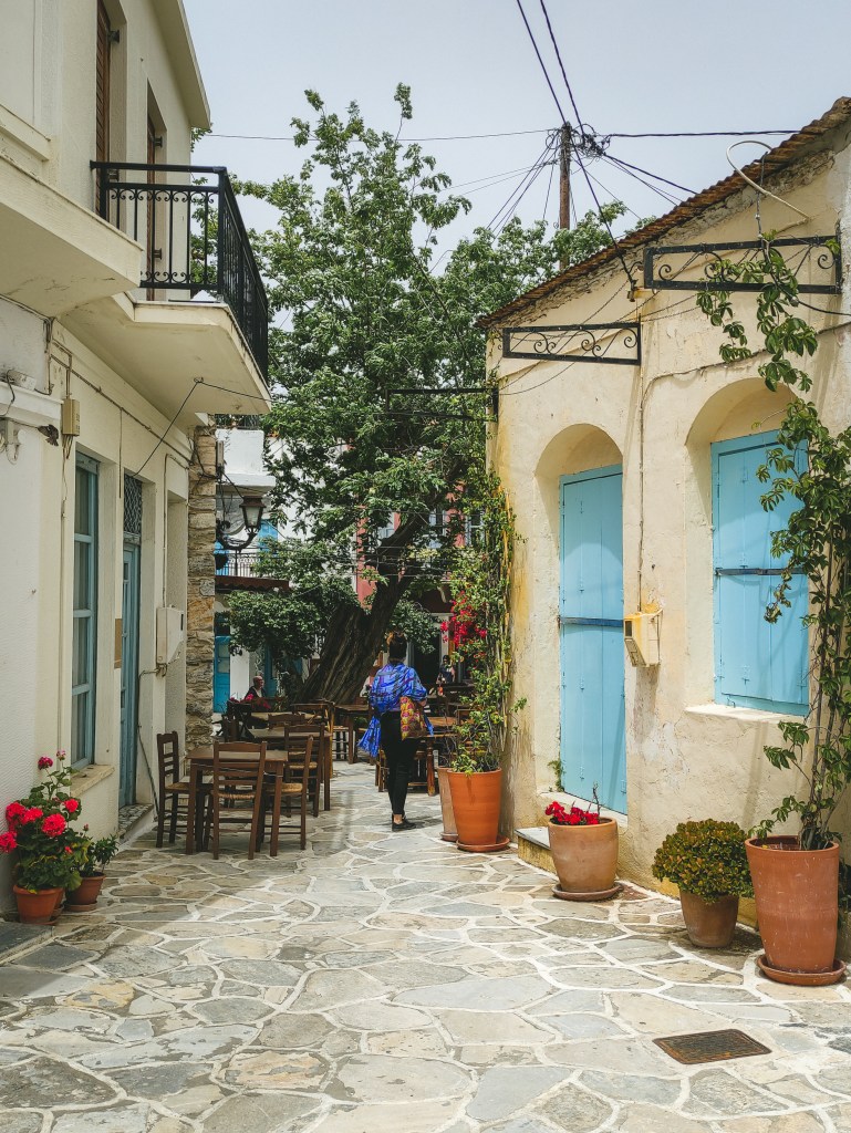O que encontrei foi uma ilha com todos os atributos que valorizo. Paisagens montanhosas, rochosas e estéreis ou verdejantes, mas sempre imponentes; praias de areia amarela e pedrinhas de todas as cores e o Egeu a brilhar no seu azul-verde transparente; vilas penduradas nas encostas, vigiadas por cristas graníticas; ruas estreitas e casas de cantos arredondados e alpendres floridos, que convidam a deixar-se ficar; comida de lamber os dedos, dezenas de variedades de queijos, peixe apanhado no dia pelo barco do restaurante. Vimos mármore por todo a lado. Nas montanhas, em bruto, nos pavimentos e muros, em estátuas e como pedras polidas à beira-mar. Admirámos buganvílias exuberantes, jasmim e flor de laranjeira a perfumar cada canto, oliveiras centenárias que rodeiam igrejas bizantinas e torres venezianas. Tudo isto, com muito pouca gente e uma população que sorriu a cada interacção, nos ofereceu vinho e sobremesas e nos fez sentir extremamente bem-vindas. Talvez fosse ser Maio e a temporada alta ainda não ter começado, talvez sejam sempre assim. Quero acreditar na última. O que é certo é que partimos com pouca vontade, de coração e vistas cheias, convictas da decisão acertada de ficar por ali os quatro dias, em vez de andar a saltitar de ilha em ilha.