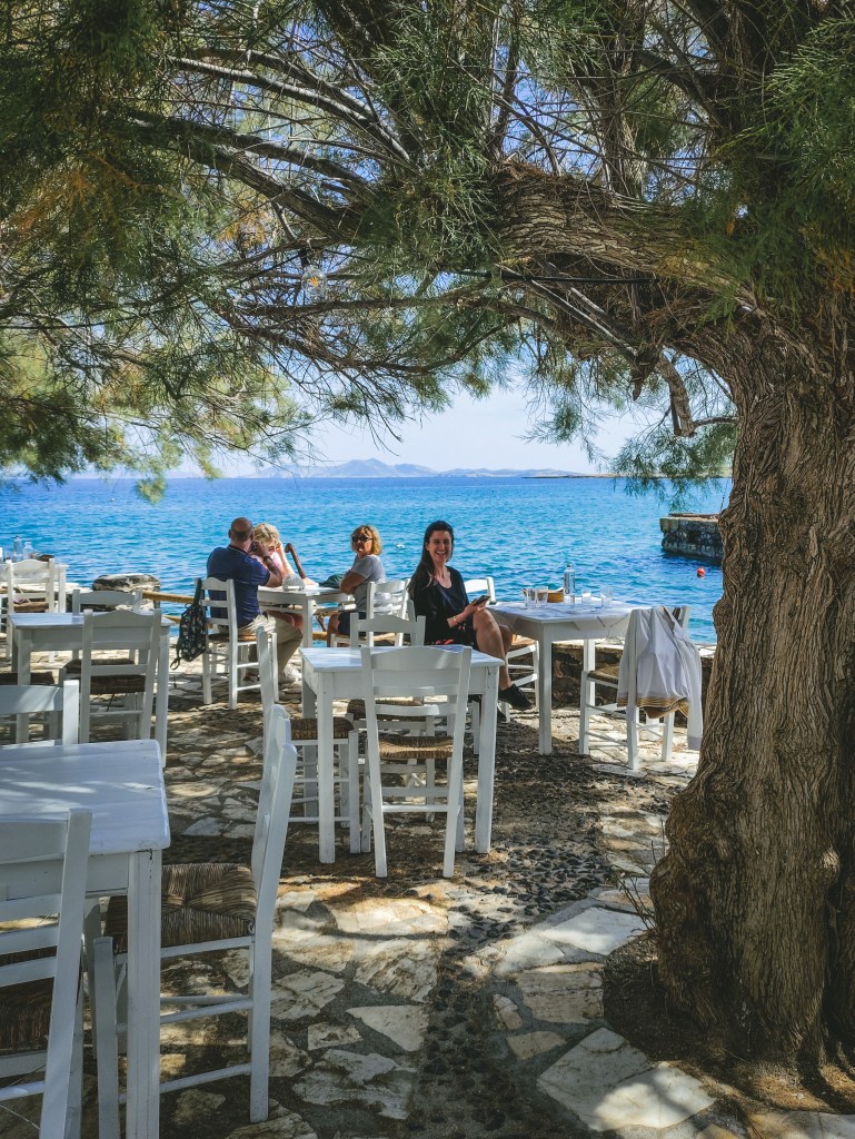 Almoçámos na aldeia de Moutsouna. Composta por umas quantas casas e um pequeno porto encostado a uma ainda mais pequena praia, imagino que seja toda uma congestão na época alta. Os três restaurantes com mesas quase em cima da água estavam, no entanto, vazios quando chegámos. Sentámo-nos no Apanemi, à sombra da enorme árvore que cobria quase toda a esplanada e na primeira linha de mesas. O amoroso rapaz que nos serviu levou-nos até ao frigorífico, para escolhermos o que queríamos almoçar da pesca do dia trazida pelo barco próprio do restaurante. Todo um luxo. Pedimos uns enormes camarões assados na grelha e ficámos por ali quase duas horas, embaladas pelo som da ondulação a bater no muro e o leve abanar das folhas na árvore, a sentirmo-nos umas privilegiadas.