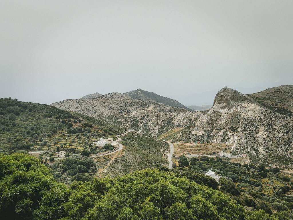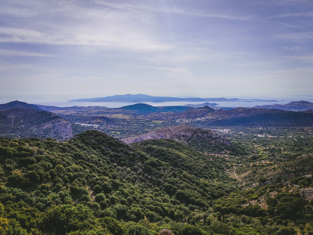 Já era meio da tarde quando partimos em direcção ao norte da ilha. O tempo começava a mudar, com nuvens esporádicas e um vento cada vez mais forte, de sudoeste. De novo no meio da ilha, virámos para uma estrada que ainda não tínhamos percorrido e demos com um miradouro que nos tirou o fôlego. À nossa frente espraiava-se quase toda a zona oeste de Naxos.