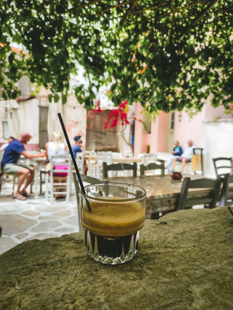 De volta à aldeia, sentámo-nos num largo, à sombra de uma videira para o inevitável freddo. Na loja ao lado, comprámos mel, azeitonas e creme de pistácio de uma produtora de uma quinta próxima, que nos deu a provar meia loja antes de nos deixar comprar o que fosse.