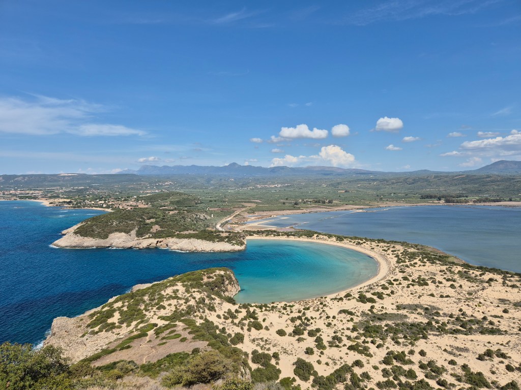 Então, este postal traz-vos um exemplo paradigmático dessa pluralidade. A praia de Voidokilia, vista da colina do Palaiokastro. Num mesmo olhar, o mar cortado pelas paredes rochosas que fazem o estreito que confere a peculiar forma de concha à praia, um extenso sistema dunar que a separa da enorme lagoa Gialova, as montanhas de Messinia e Arcadia no horizonte. Nas nossas costas e debaixo dos nossos pés, invisíveis nesta imagem, a muralha da Fortaleza de Antigo Navarino cujas ruínas são principalmente da época da ocupação franca da Grécia, mas com fundações de um castelo grego muito mais antigo. Assistiu a batalhas desde a Guerra do Peloponeso no século V a.C. até à Guerra da Independência Grega de 1821. Subimos até ela por um trilho empinadísso, que passava também pela enorme “Gruta de Nestor”.